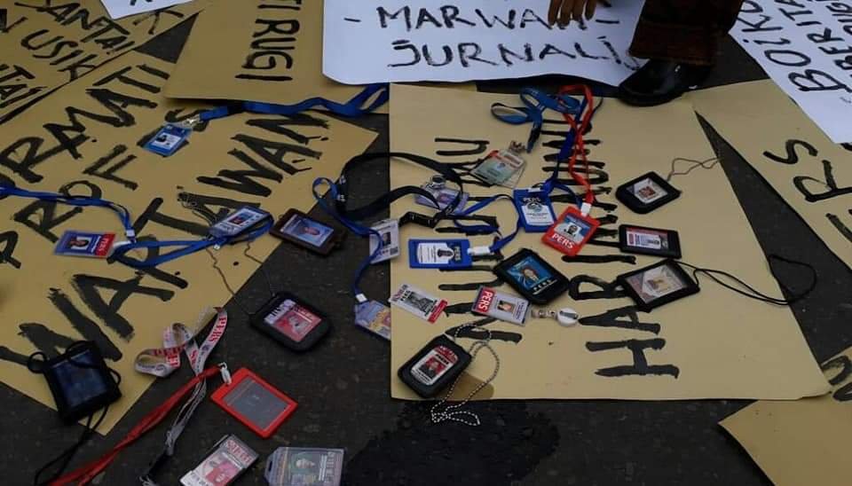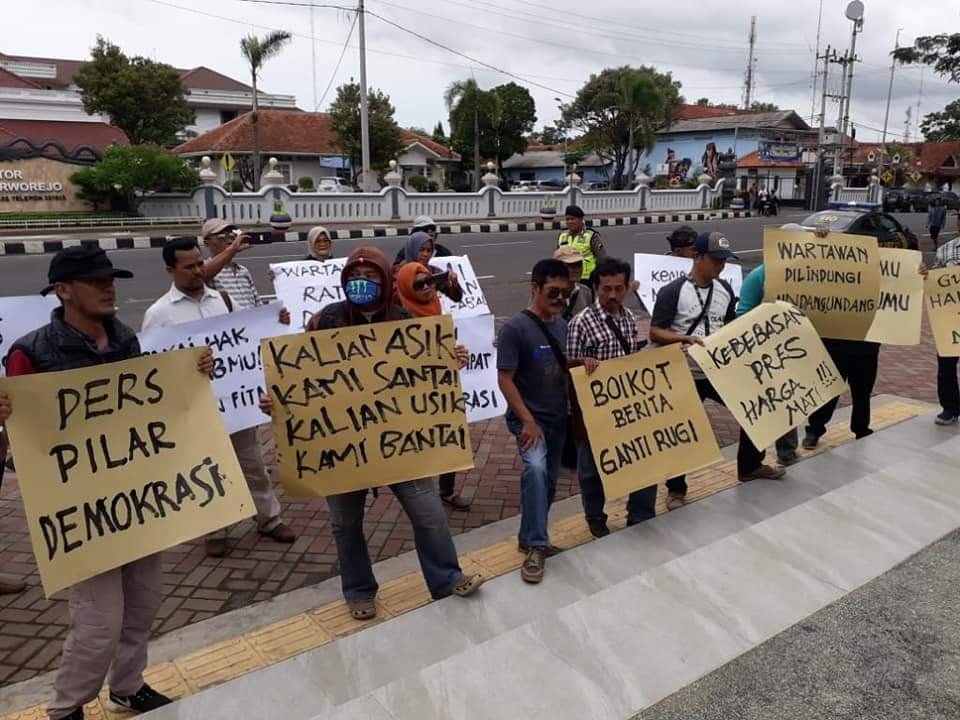 Purworejo- Wartawan dari berbagai media yang bertugas di Kabupaten Purworejo, Jawa Tengah menggelar aksi unjuk rasa pada Kamis, 9/1/2020.
