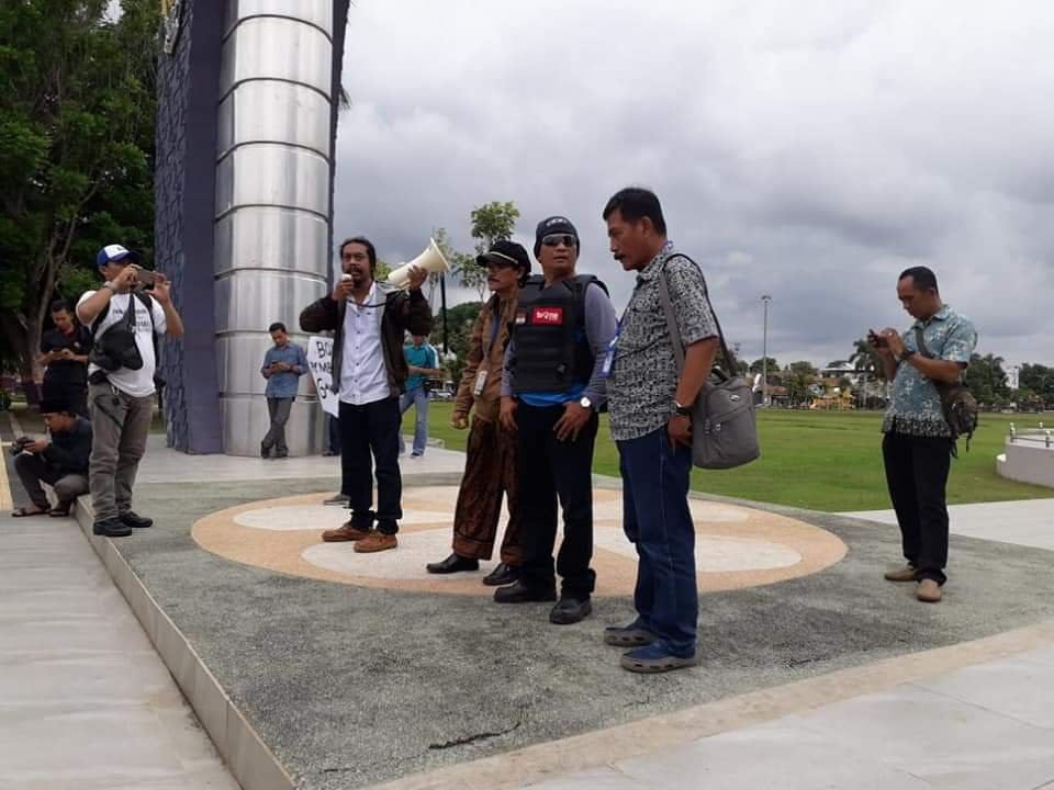 Aksi demo jurnalis yang berlangsung di depan Kantor Bupati, wartawan melakukan orasi pernyataan sikap bahwa mulai hari ini wartawan akan memboikot berita terkait jual beli harga tanah terdampak Bendungan Bener.