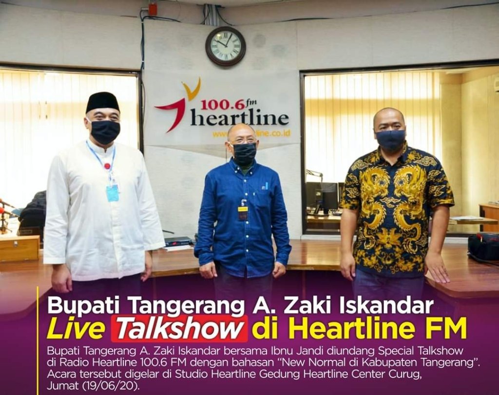 Tangerang – Bupati Tangerang A. Zaki Iskandar bersama Ibnu Jandi diundang Special Talkshow di Radio Heartline 100.6 FM dengan bahasan “New Normal di Kabupaten Tangerang”. Acara tersebut digelar di Studio Heartline Gedung Heartline Center Curug, Jumat (19/06/20).